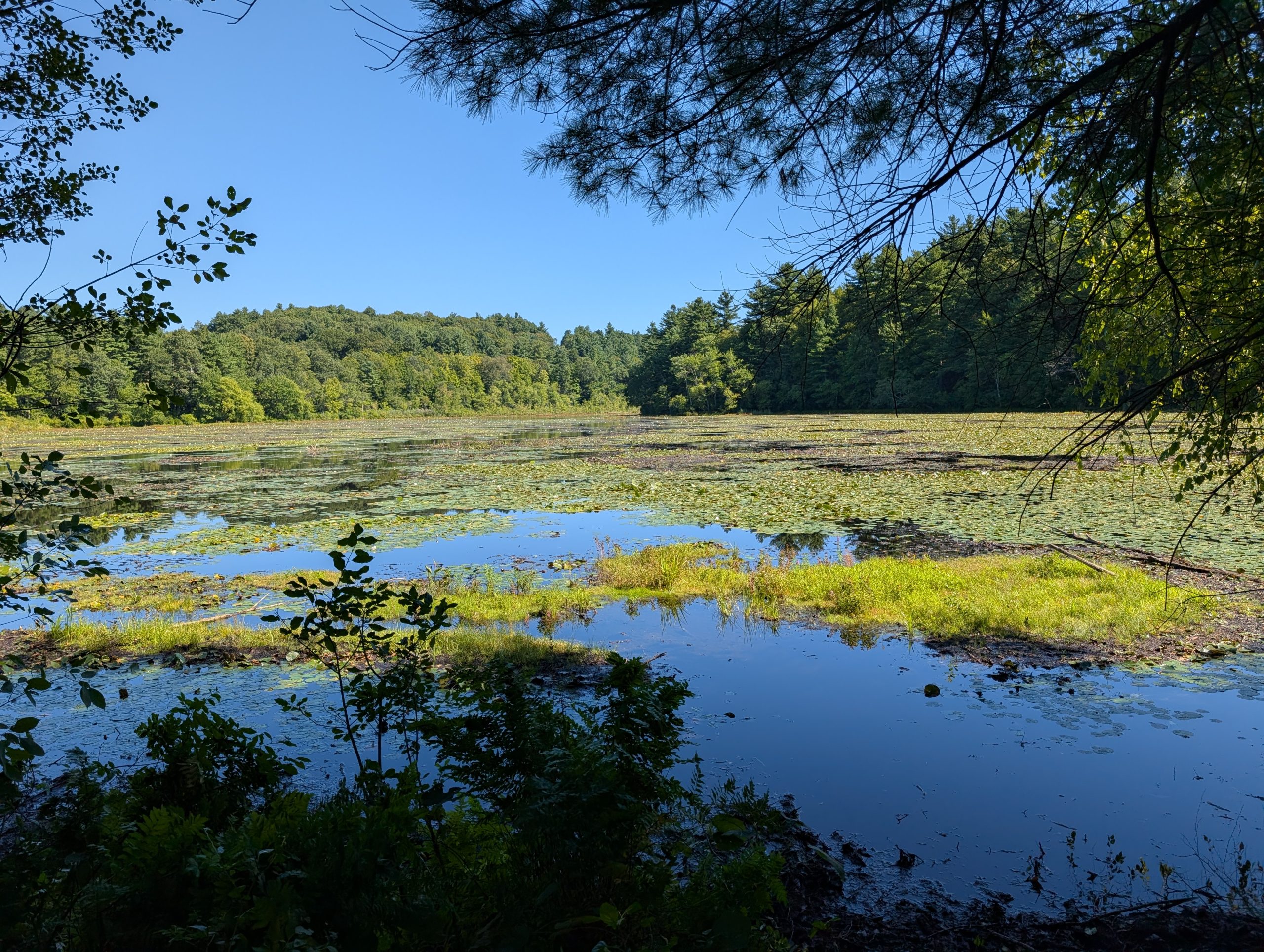 Martins Pond is located smack in the middle of Groton. This trail takes you from the Scarlet Hill parking area most of the way to the the connecting Priest Family Conservation Area but you have to walk about 250 yards on Martins Pond Road to the dirt road that takes you to the Priest trail. The property consists of woodlands and wetlands along the outflow to Martin’s Pond.  Although only a 3/4 mile trail, the trail offers two close up views of the pond.